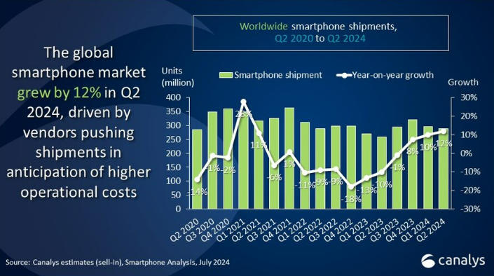 Laut Zahlen von Canalys wurden im zweiten Quartal 2024 weltweit 288,9 Millionen Smartphones abgesetzt. Das entspricht im Vergleich zum Vorjahr einem Plus von 12 Prozent. In Europa betrug das Wachstum 14 Prozent.