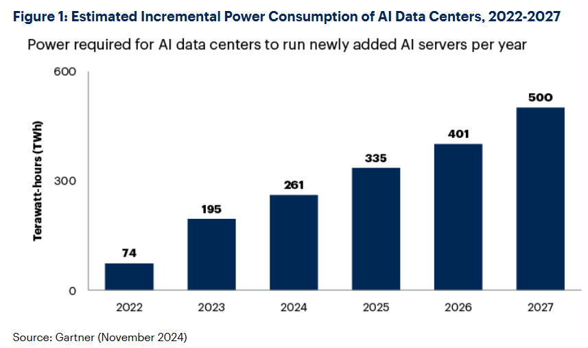 Gartner werden bis 2027 etwa 40 Prozent der KI-Rechenzentren weltweit durch Strommangel in ihrer Betriebsfähigkeit eingeschränkt sein. Der rasante Ausbau von Hyperscale-Rechenzentren für generative KI (GenAI) – die Marktforscher rechnen in den nächsten zwei Jahren mit einem Wachstum von bis zu 160 Prozent – führe zu einem Anstieg des Stromverbrauchs, der die Kapazität der Energieversorger überfordert. Bis 2027 wird der Strombedarf für KI-optimierte Server laut Gartner auf 500 Terawattstunden jährlich ansteigen – 2,6-mal so viel wie 2023. "Die Nachfrage nach Energie wächst schneller als die Versorgungsinfrastruktur ausgebaut werden kann. Dies gefährdet das Wachstum neuer Rechenzentren und erhöht die Betriebskosten erheblich", erklärt Gartner angesichts dieser Entwicklung.