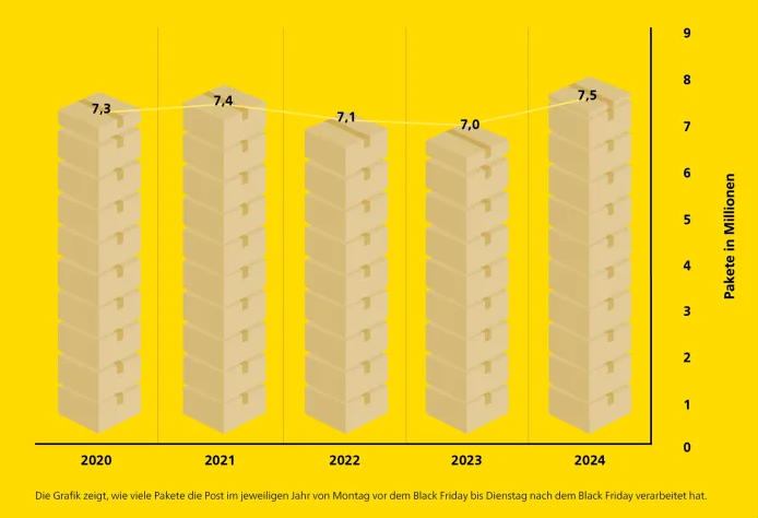 Die Schweizer Post meldet einen neuen Rekord für die Woche rund um Black Friday und Cyber Monday. Wie das Unternehmen mitteilt, wurden vom 25. November bis zum 3. Dezember 2024 rund 7,5 Millionen Pakete sortiert und ausgeliefert. Das sind knapp 500'000 mehr als im Jahr zuvor, was ein neuer Rekord ist. Bislang lag der Rekord bei 7,4 Millionen Paketen im Jahr 2021.