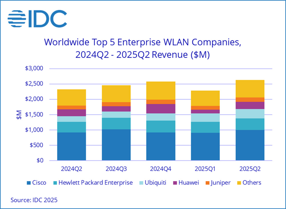 Den höchsten Marktanteil bei Enterprise WLAN erreichte Cisco mit 37,8 Prozent, Entsprechend einem Umsatz von 996,1 Millionen Dollar. Das Wachstum betrug hier 8 Prozent. HPE Aruba Networking belegt 14,3 Prozent des Marktes mit einem Umsatz von 376,3 Millionen Dollar und einem Wachstum von 9,3 Prozent. An dritter Stelle folgt Ubiquiti mit einem Marktanteil von 11,9 Prozent, einem Umsatz von 312,4 Millionen Dollar und dem grössten Wachstum gegenüber dem Vorjahresquartal von 66,8 Prozent. Der Marktanteil von Huawei lag bei 9 Prozent, entsprechend einem Umsatz von 235,9 Millionen Dollar und einem Wachstum von 5,4 Prozent. Juniper Networks erreichte ein Wachstum von 20,4 Prozent auf 141,9 Millionen Dollar, was einem Marktanteil von 5,4 Prozent entspricht. Zu beachten ist hier, dass HPE im Juli 2025 die Übernahme von Juniper abgeschlossen hat.