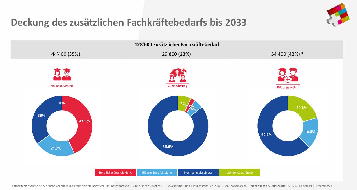 Die aktuellen Zahlen zeigen grundsätzlich, dass das Berufsfeld ICT weiterhin überdurchschnittlich schnell wächst: 266’000 Personen übten 2024 eine ICT-Tätigkeit aus. Dies sind 68 Prozent mehr als im Jahr 2010 und knapp 3 Prozent mehr als 2022. Und das Wirtschaftswachstum und die fortschreitende digitale Transformation führen laut ICT-Berufsbildung Schweiz in den kommenden Jahren zu einem Brutto-Bedarf von insgesamt 128'600 zusätzlichen ICT-Fachkräften. Davon können voraussichtlich rund 44'400 Personen über das Bildungssystem und 29'800 durch Zuwanderung gedeckt werden. Dennoch bleibe eine erhebliche Lücke von 54'400 ICT-Fachkräften, die zusätzlich ausgebildet werden müssen, so die Schlussfolgerung. "Ausbildung braucht Zeit – wir müssen bereits heute handeln, um diese Lücke zu vermeiden", betont Marc Marthaler, Geschäftsführer von