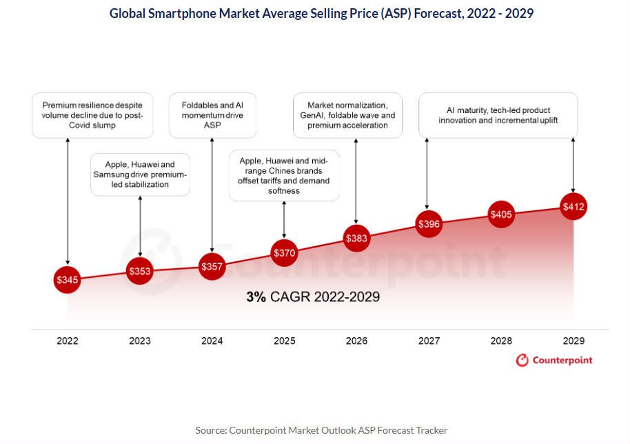 Counterpoint Research wird der durchschnittliche Verkaufspreis (ASP) von Smartphones weltweit bis 2029 auf 412 US-Dollar steigen. In diesem Jahr liegt der ASP noch bei 370 US-Dollar. Dies entspricht einem jährlichen Wachstum von rund 3 Prozent.