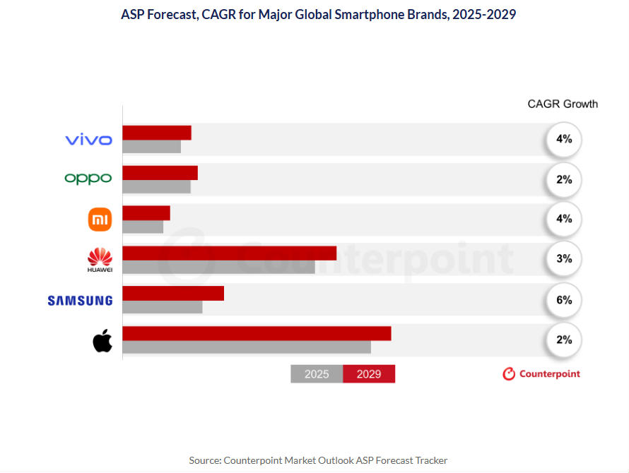 Apple bleibt laut Counterpoint mit seinen Premium-Produkten ein wesentlicher Treiber im Hochpreissegment. Der durchschnittliche Verkaufspreis für iPhones soll von 919 US-Dollar im Jahr 2025 auf knapp 1000 US-Dollar im Jahr 2029 steigen. Die Entwicklung wird unter anderem durch den zunehmenden Absatz der Pro-Modelle sowie eine stärkere Präsenz in Schwellenmärkten gestützt.