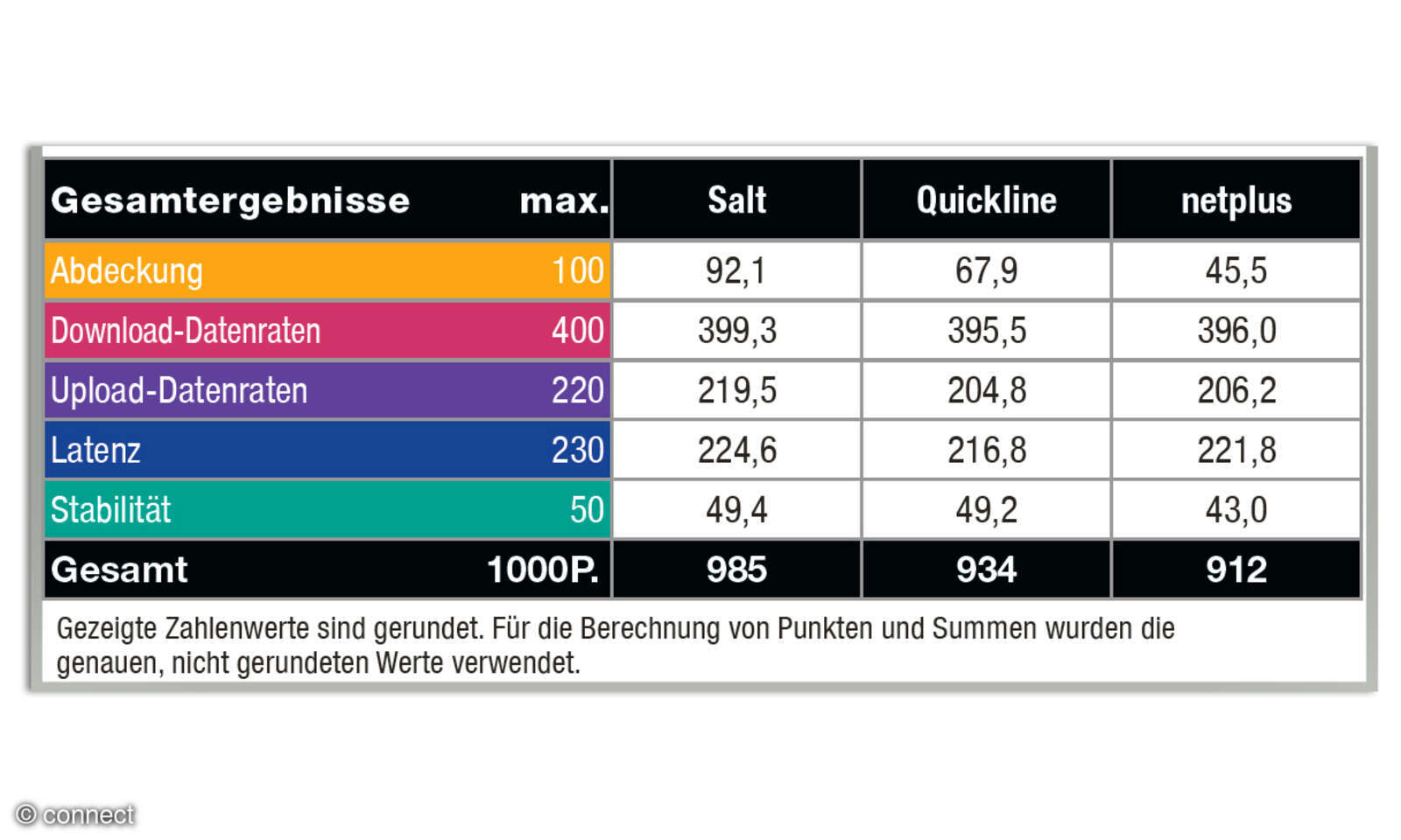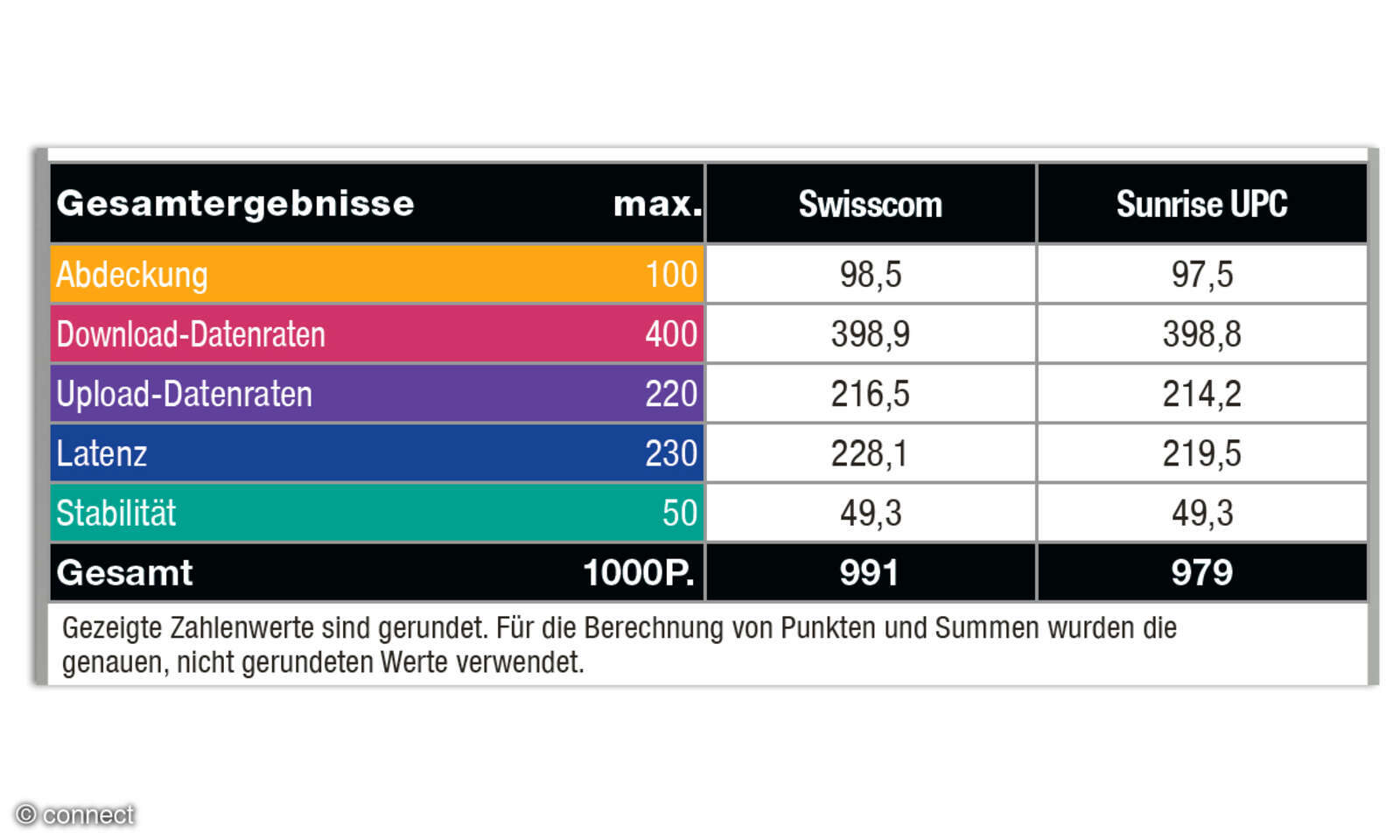 Gewinnerin des Rennens ist Swisscom mit einer Punktzahl von 991 Punkten (max. 1000 Punkte) und einem Marktanteil von 45 Prozent. Sunrise (Marktanteil: 30,5 Prozent) ist mit einem kaum nennenswerten Unterschied und einer Punktzahl von 979 auf Platz zwei. Die Kategorie Latenz ist hierbei das einzige Kriterium, bei dem Swisscom entscheidend Boden gutgemacht hat (228,1 statt 219,5 Punkte, max. 230). In allen anderen Bereichen (Abdeckung, Download, Upload und Stabilität) liegt der Unterschied bei unter drei Punkten. Das Ergebnis widerspiegelt auch ziemlich genau die Resultate aus dem vergangenen Jahr – auch hier war die Latenz das Kriterium, das Swisscom einen nennenswerten Vorsprung verschaffte. "Connect" betont aber, dass bei beiden Anbietern eine Verbesserung