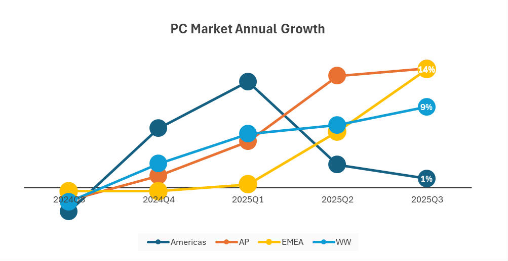 Das nahende Ende von Microsofts Unterstützung für Windows 10 hat dem globalen PC-Markt zu einem regelrechten Boom verholfen, wie aktuelle Zahlen von IDC belegen. Gemäss vorläufigen Zahlen stiegen die Verkäufe zwischen Juli und September auf 75,9 Millionen Geräte, womit 9,4 Prozent mehr PCs als in der Vorjahresperiode abgesetzt wurden. Aus regionaler Perspektive entwickelte sich der Markt allerdings höchst unterschiedlich. Während etwa im EMEA- wie auch im asiatisch-pazifischen Raum mit 14 Prozent im Q3 das höchste Wachstum des Jahres erreicht wurde, erreichte der Markt in den USA bereits im Q1 mit über 12 Prozent das höchste Wachstum, während im Q3 lediglich noch ein Plus von einem Prozent herausschaute.