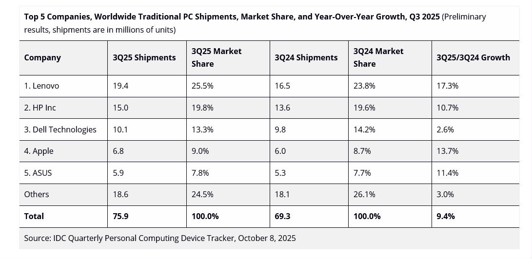 Lenovo steigerte den Absatz im Q3 um über 17 Prozent auf 19,4 Millionen Rechner, wodurch sich der Marktanteil auf 25,5 Prozent verbesserte. Auch