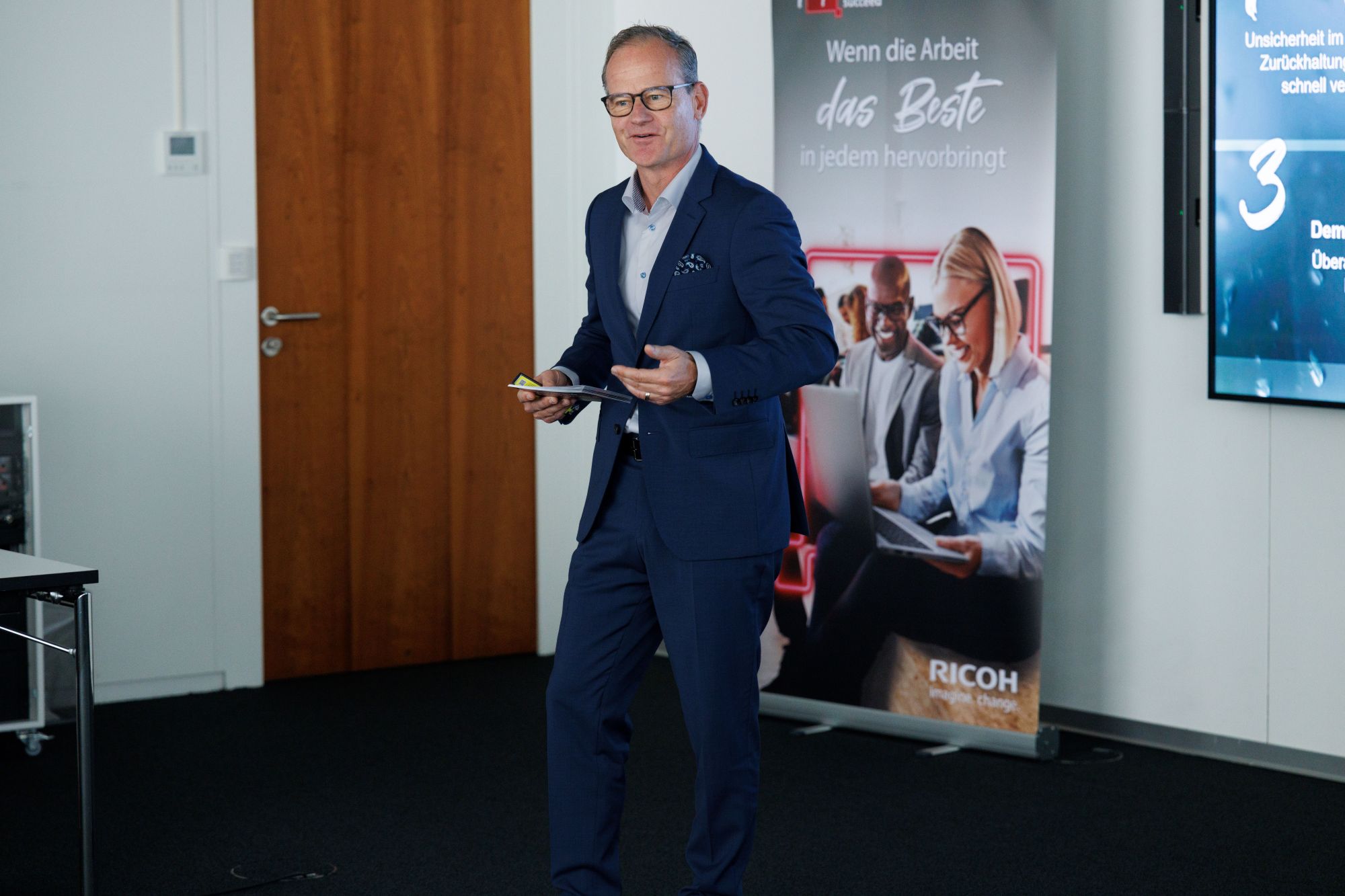 Daniel Tschudi, CEO von Ricoh Schweiz, zeigte die vier grössten Herausforderungen – und seine dazugehörigen Lösungsansätze – für den Schweizer Markt auf. (Quelle: Ricoh Schweiz)