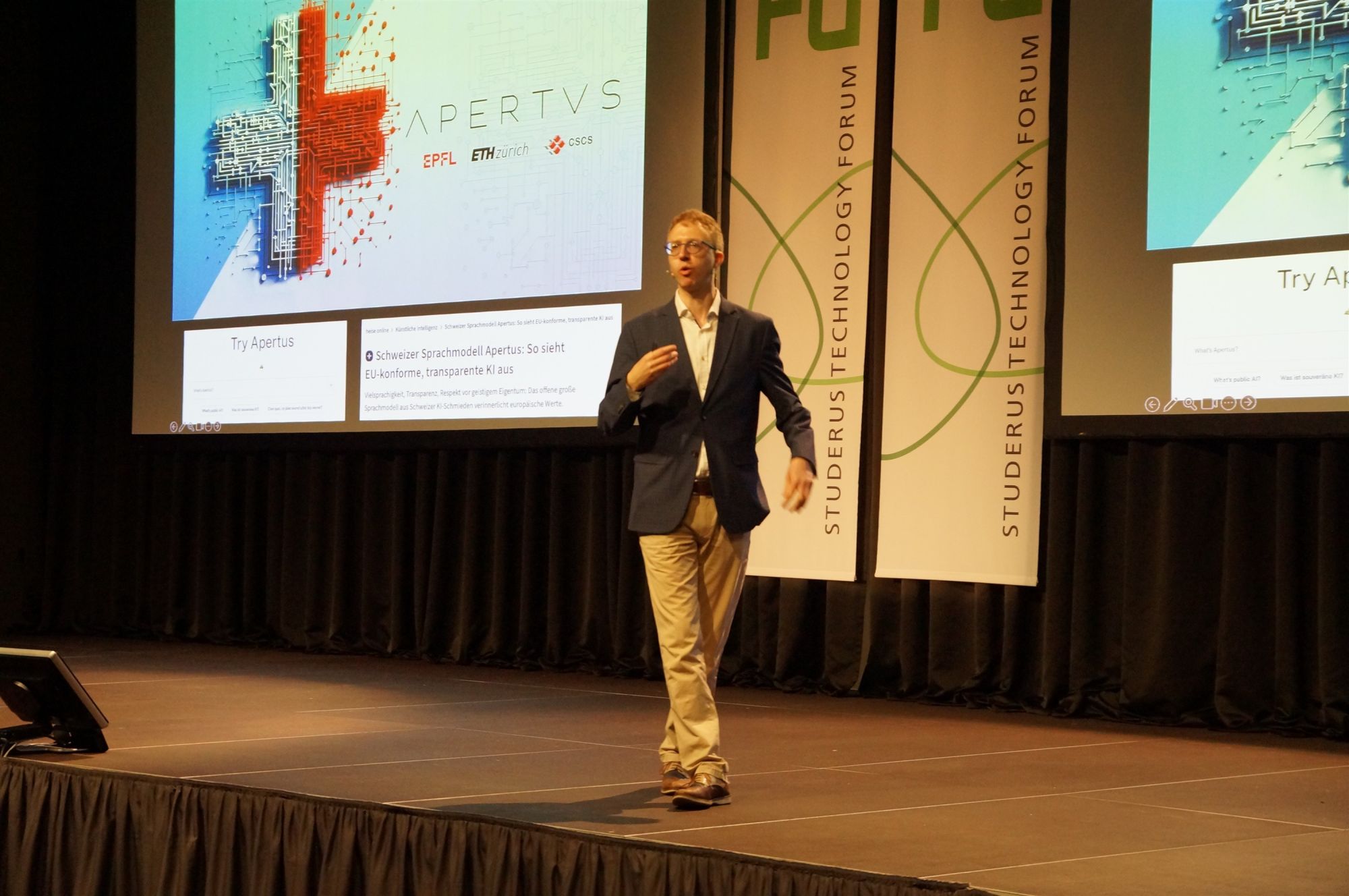 Im Anschluss folgte die gleichwohl spannende wie unterhaltsame Keynote von Prof. Dr. Marc Pouly, Professor für Informatik an der Hochschule Luzern. Er beleuchtete den Einfluss Künstlicher Intelligenz auf IT und KMU und zeigte dabei unter anderem auf, wie sich KI datenschutzkonform nutzen lässt, welche Ressourcen die Technologie benötigt ("Wir haben Energie auch schon weniger sinnvoll genutzt"), wo die Grenzen aktueller Sprachmodelle liegen ("KI hat kein Wahrheitsbewusstsein") und wohin die Entwicklung noch führen könnte. Auf die einzige Publikumsfrage – ob man Halluzinationen in den Griff bekommen werde – antwortete er zum Abschluss mit: "Nein, mit der heutigen Technologie nicht."