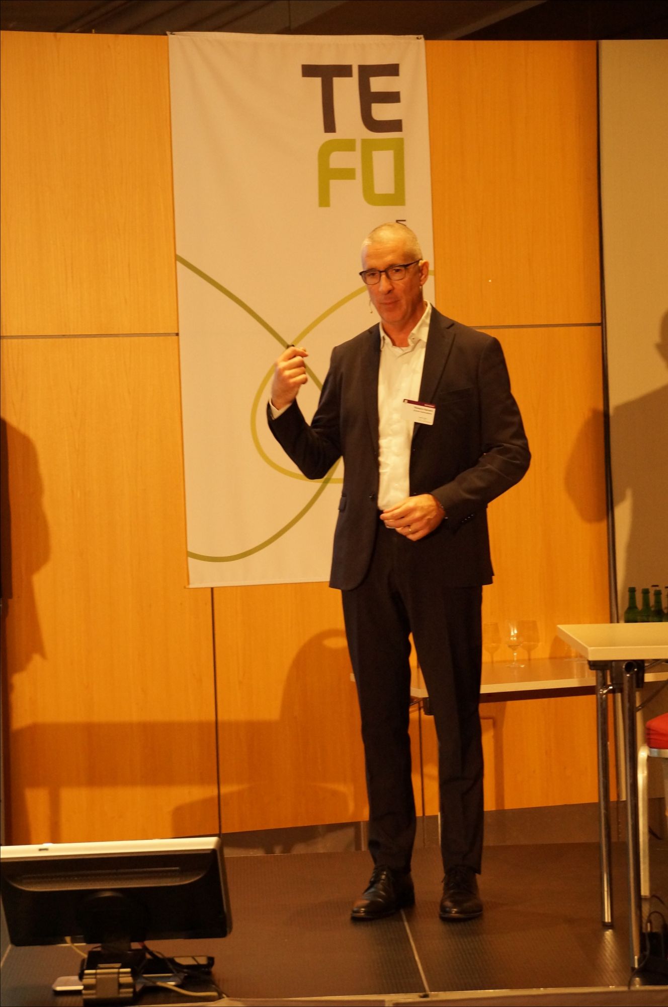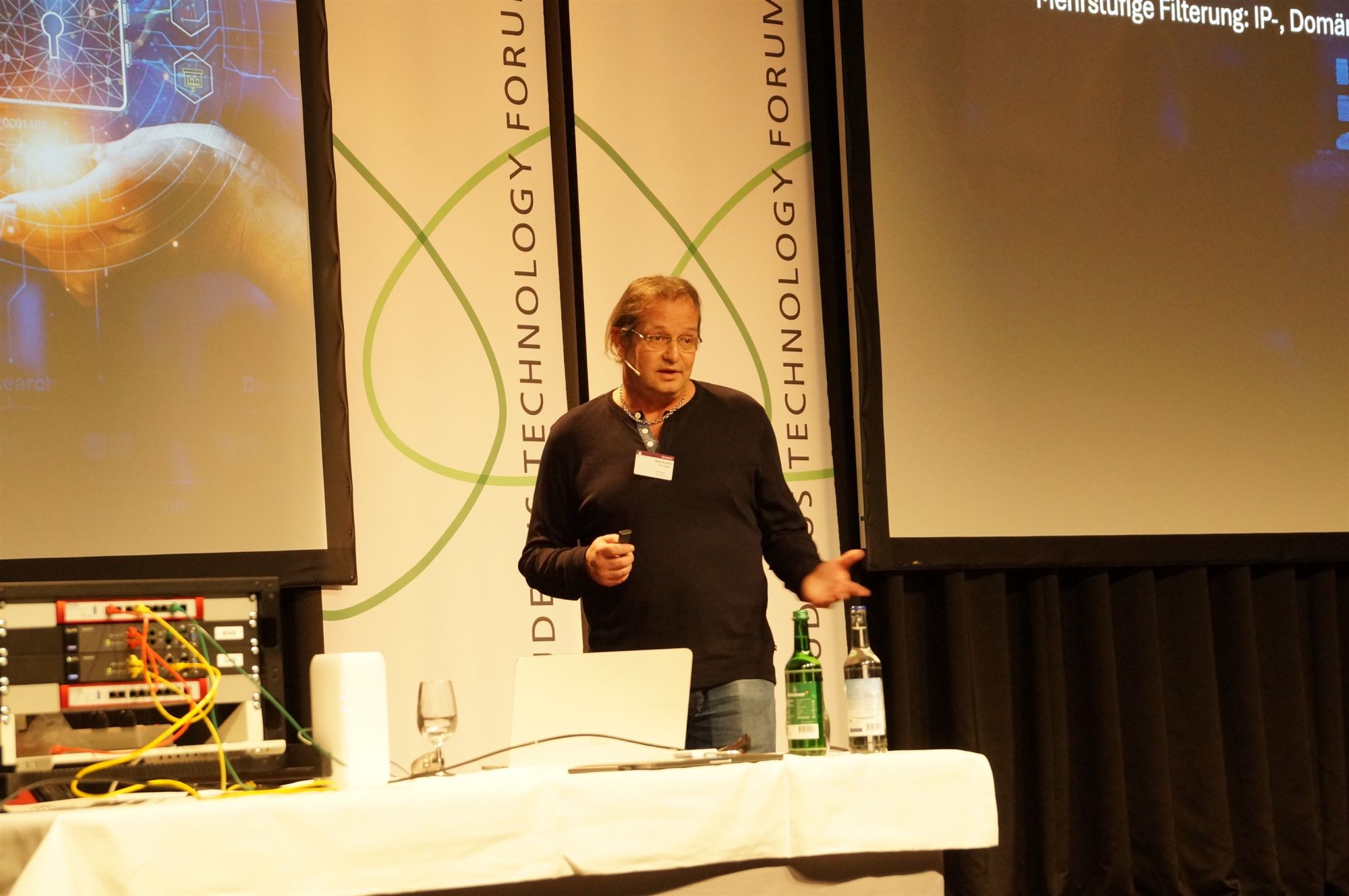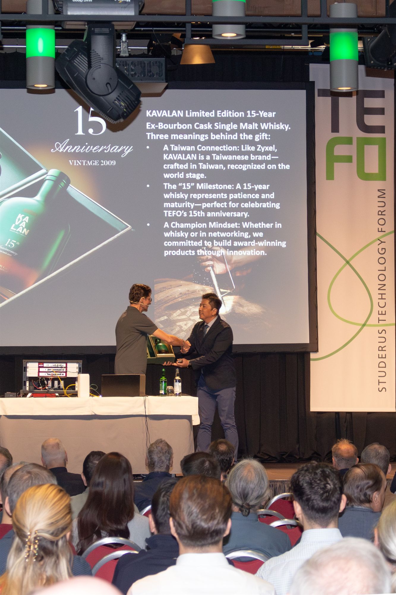 Studerus, sondern auch von Ken Tsai, dem Präsidenten von Zyxel Networks, der zum 15. TEFO-Jubiläum eigens aus Taiwan anreiste. Tsai würdigte das Jubiläum mit einer symbolischen Geste und überreichte Frank Studerus eine 15-jährige Whiskyflasche. In seiner Keynote thematisierte er die geopolitischen Herausforderungen in Taiwan, dem Heimatmarkt von