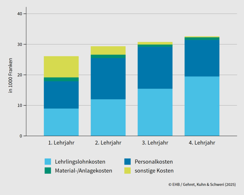 Ein Grossteil der Bruttokosten entfällt auf Löhne und Ausbildungspersonal. Die Lehrlingslöhne steigen im Verlauf der Ausbildung von 630 Franken im ersten auf 1400 Franken im vierten Lehrjahr. Der Aufwand für Ausbildnerinnen und Ausbildner von durchschnittlich 5,6 Stunden im ersten Lehrjahr sinkt im vierten Lehrjahr auf durchschnittlich vier Stunden pro Woche. Die produktive Arbeitszeit nimmt im Verlauf der Ausbildung deutlich zu.