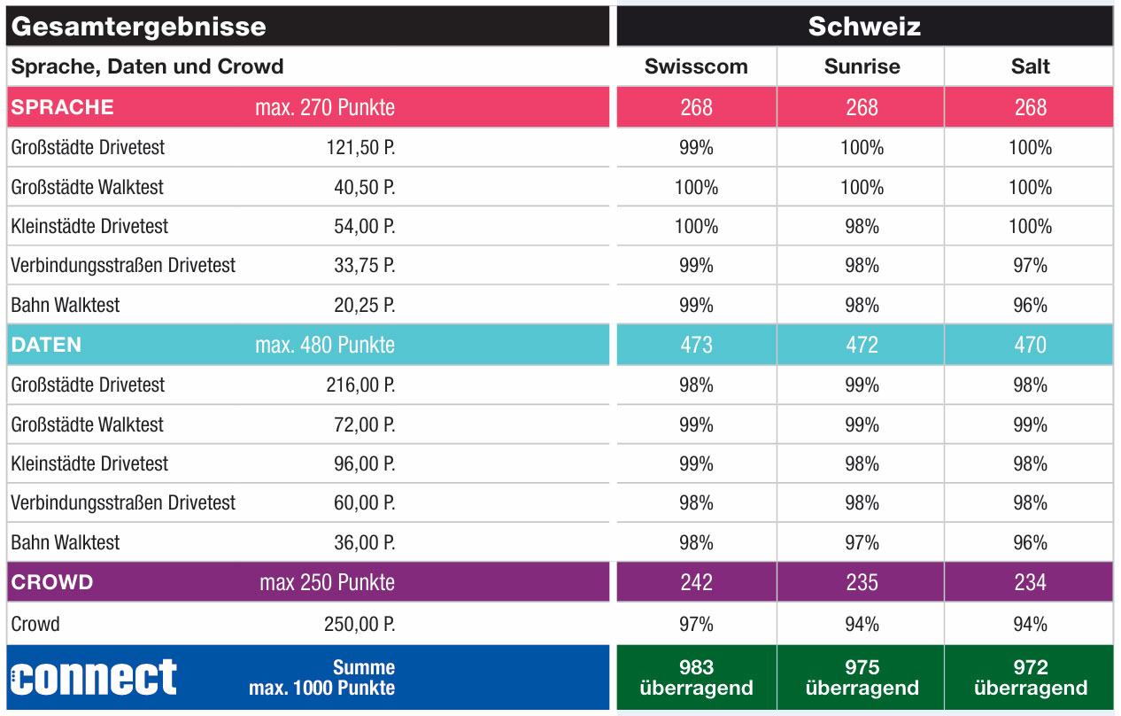 Swisscom den jährlichen Mobilfunknetztest der Zeitschrift "Connect" für sich entscheiden. Dabei holt Swisscom nicht nur innerhalb der Schweiz die höchste Punktzahl, sondern auch im Vergleich mit den deutschen und österreichischen Providern. In dem gross angelegten Test, den es seit mittlerweile 32 Jahren gibt, werden heuer Messungen zu Datenverbindungen mit 48 Prozent gewichtet, Sprachtelefonie mit 27 Prozent und Testergebnisse von fast 3 Millionen Endanwendern ("Crowd") mit 25 Prozent.
