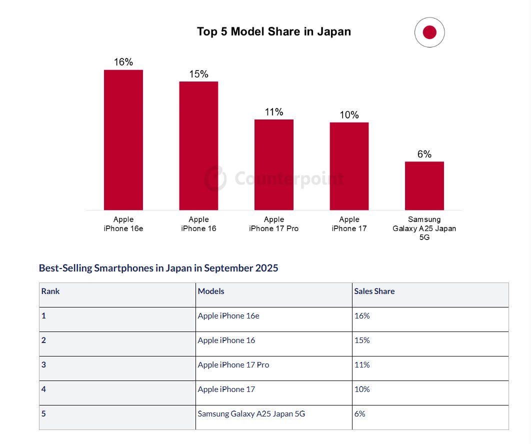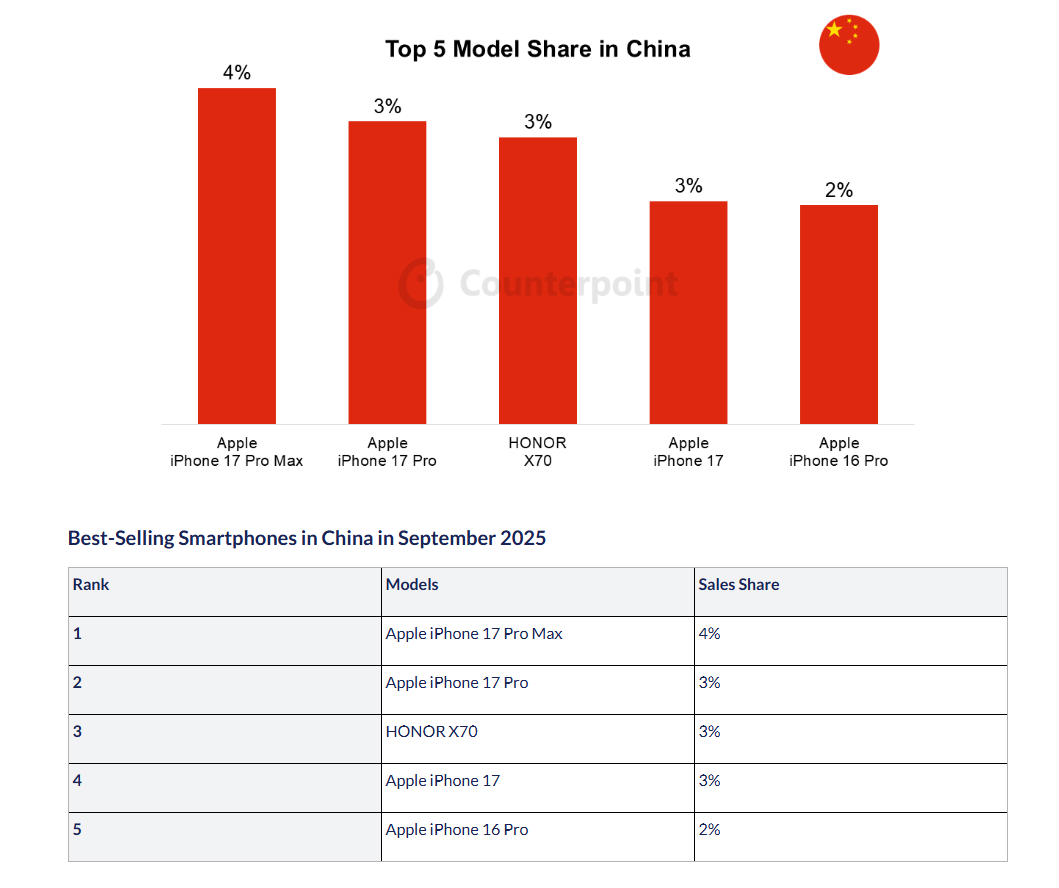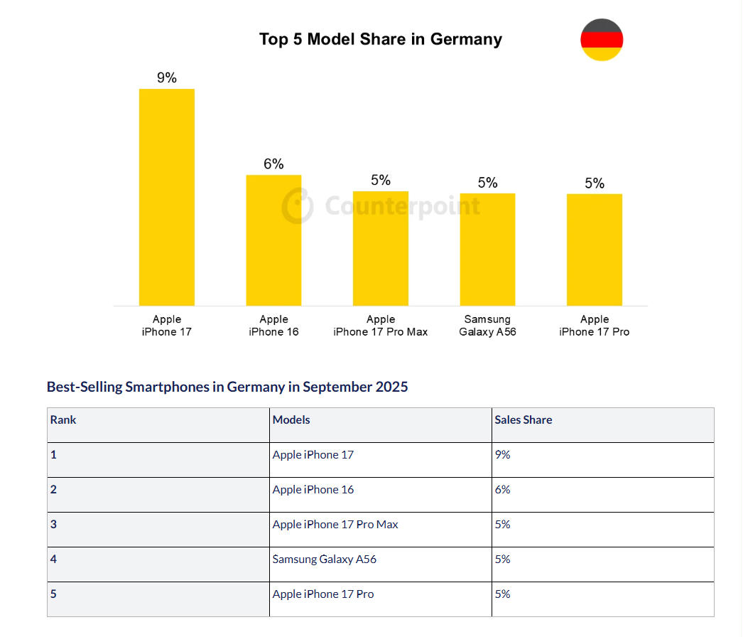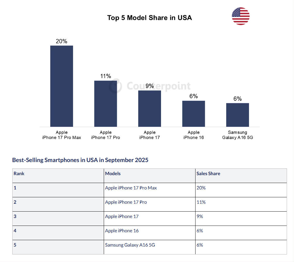 Counterpoint hat ausserdem Zahlen veröffentlicht, die zeigen, welches Smartphone-Modell im September in acht Ländern am häufigsten verkauft wurde. In den USA kommt das iPhone 17 Pro Max dabei auf einen Anteil von 20 Prozent, vor dem iPhone 17 Pro mit 11 und dem iPhone 17 mit 9 Prozent. In China liegt ebenfalls das iPhone 17 Pro Max an der Spitze mit 4 Prozent, vor dem iPhone 17 Pro mit 3 Prozent. In Indien liegt das iPhone 16 auf Platz eins (4%), in Deutschland das iPhone 17 (9%), in den UK das iPhone 17 Pro (8%) und in Japan das iPhone 16e (16%). In Frankreich auf Platz eins liegt das Samsung Galaxy S25 mit 10 Prozent, und in Korea das Samsung Galaxy Z Flip 7 mit 17 Prozent.