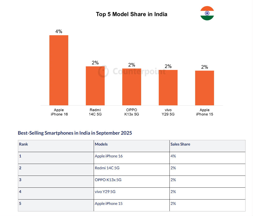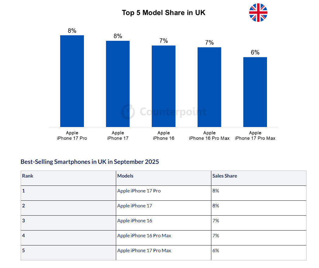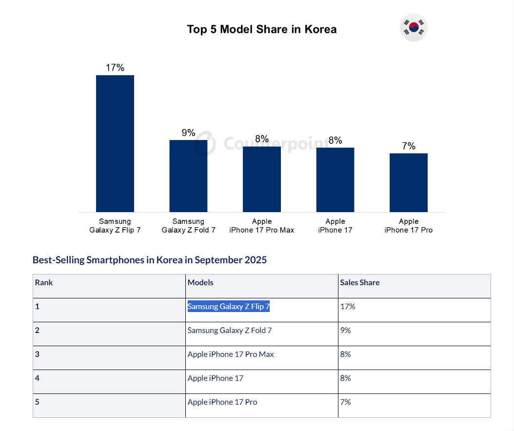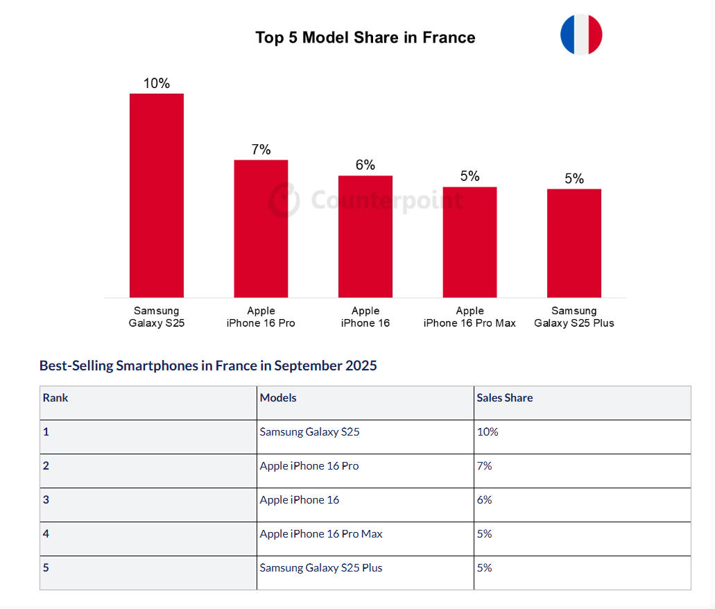 Counterpoint hat ausserdem Zahlen veröffentlicht, die zeigen, welches Smartphone-Modell im September in acht Ländern am häufigsten verkauft wurde. In den USA kommt das iPhone 17 Pro Max dabei auf einen Anteil von 20 Prozent, vor dem iPhone 17 Pro mit 11 und dem iPhone 17 mit 9 Prozent. In China liegt ebenfalls das iPhone 17 Pro Max an der Spitze mit 4 Prozent, vor dem iPhone 17 Pro mit 3 Prozent. In Indien liegt das iPhone 16 auf Platz eins (4%), in Deutschland das iPhone 17 (9%), in den UK das iPhone 17 Pro (8%) und in Japan das iPhone 16e (16%). In Frankreich auf Platz eins liegt das Samsung Galaxy S25 mit 10 Prozent, und in Korea das Samsung Galaxy Z Flip 7 mit 17 Prozent.