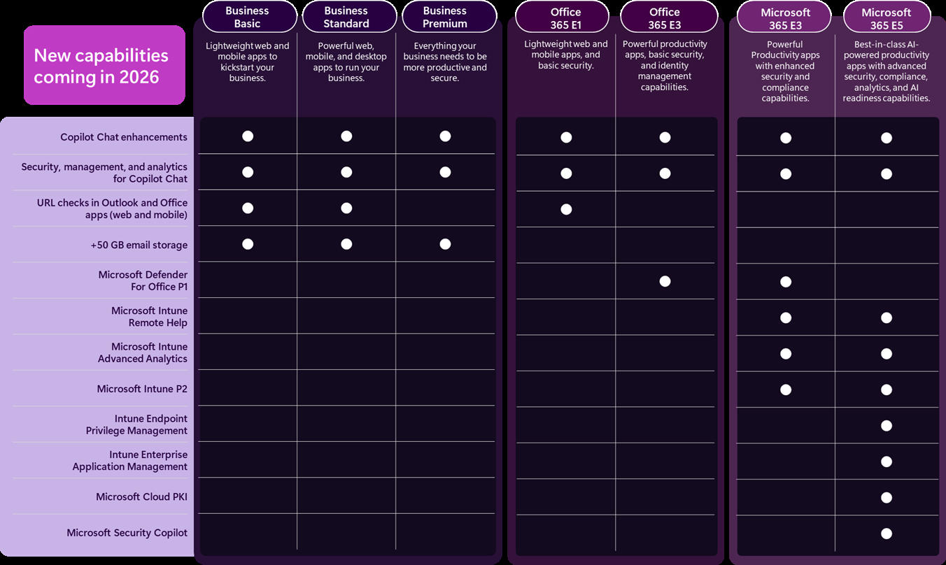So werden alle Preispläne im kommenden Jahr mit Erweiterungen für Copilot Chat ergänzt. Hinzu kommen Neuerungen in den Bereichen Security, Management und Analytics für Copilot Chat. Business Basic, Business Standard sowie Office 365 E1 werden zudem um eine URL-Prüfung in Outlook und den Office-Apps erweitert und die drei Business-Pläne bekommen 50 GB zusätzlichen Mail-Speicher. Weitergehende Funktionen, die insbesondere die Endpoint-Management-Lösung Intune betreffen, sollen ferner in den E3- und E5-Plänen dazukommen.