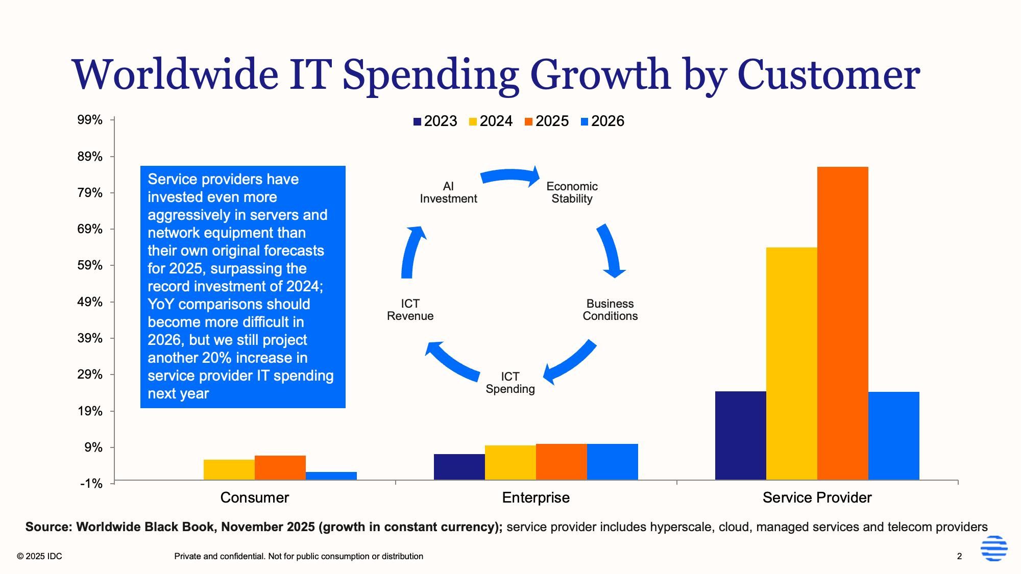 IDC bislang keine Anzeichen für eine Verlangsamung. Und Umfragen würden zeigen, dass die meisten Unternehmen trotz anhaltender Unsicherheit hinsichtlich der Gesamtwirtschaft planen, ihre IT-Budgets im Jahr 2026 erneut zu erhöhen. Die Marktanalysten prognostizieren für das kommende Jahr einen Anstieg der IT-Ausgaben um 10 Prozent. Damit wächst der Markt zwar langsamer als 2025, aber immer noch deutlich schneller als in den Jahren zuvor.