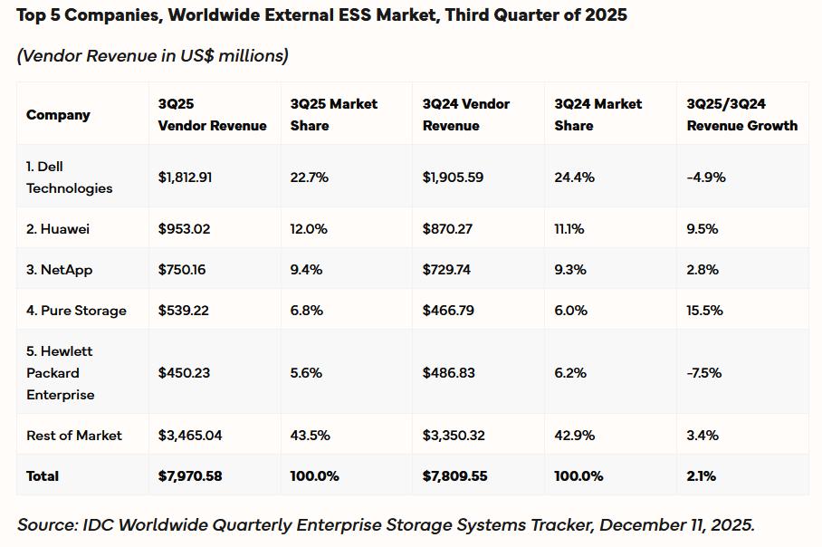Bei den Herstellern blieb Dell Technologies trotz eines leichten Umsatzrückgangs von 4,9 Prozent Marktführer mit einem Anteil von 22,7 Prozent. Huawei rückte mit einem Marktanteil von 12 Prozent auf Platz zwei vor, Netapp belegte mit 9,4 Prozent Rang drei. Pure Storage erreichte dank zweistelligem Wachstum (+15,5 %) einen Marktanteil von 6,8 Prozent und Platz vier. Hewlett Packard Enterprise komplettierte die Top fünf mit einem Anteil von 5,6 Prozent. (sta)