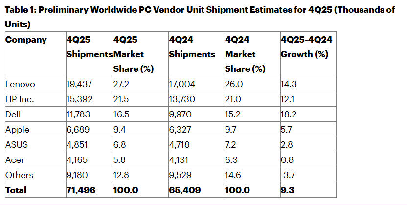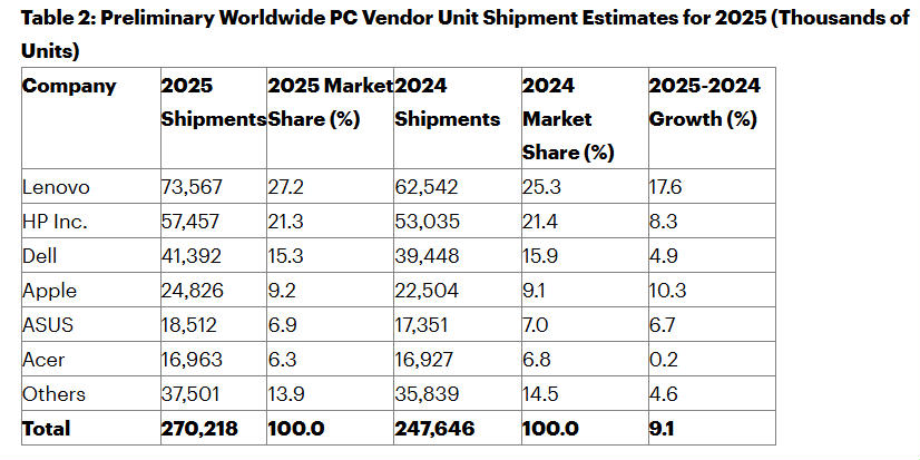 Lenovo führte den weltweiten PC-Markt 2025 mit einem Anteil von 27,2 Prozent und einem Wachstum von 17,6 Prozent an, gefolgt von HP mit 21,3 Prozent (8,3 Prozent Wachstum) und Dell mit 15,3 Prozent (4,9 Prozent Wachstum). Dahinter folgen auch bei Gartner Apple mit 9,1 Prozent (plus 10,3%) und Asus mit 7 Prozent (plus 6,7%).