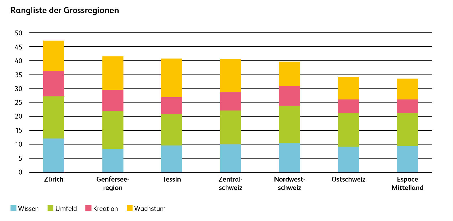 Erstmals wurden in der aktuellen Erhebung auch die Grossregionen miteinander verglichen. Die Region Zürich belegt dabei den ersten Platz, gefolgt von der Genferseeregion, dem Tessin und der Zentralschweiz. Die Nordwestschweiz folgt knapp dahinter, während Ostschweiz und Espace Mittelland weiter zurückliegen.