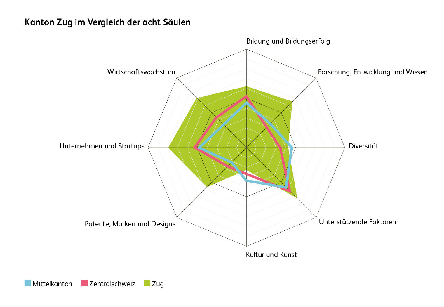 Wie bereits bei der Erstausgabe liegt Zug auch heuer an der Spitze des Index, vor Basel-Stadt und Zürich. Zug behauptet laut den Studienverfassern seine Spitzenposition dank starker Werte bei Unternehmensgründungen, Wirtschaftswachstum und günstigen Rahmenbedingungen wie steuerlichen Anreizen. Basel-Stadt überzeigt im Kulturbereich und nimmt eine führende Rolle bei der Diversität ein. Zürich erzielt in nahezu allen Bereichen konstant gute Resultate und präsentiert sich als breit aufgestellter Kanton.