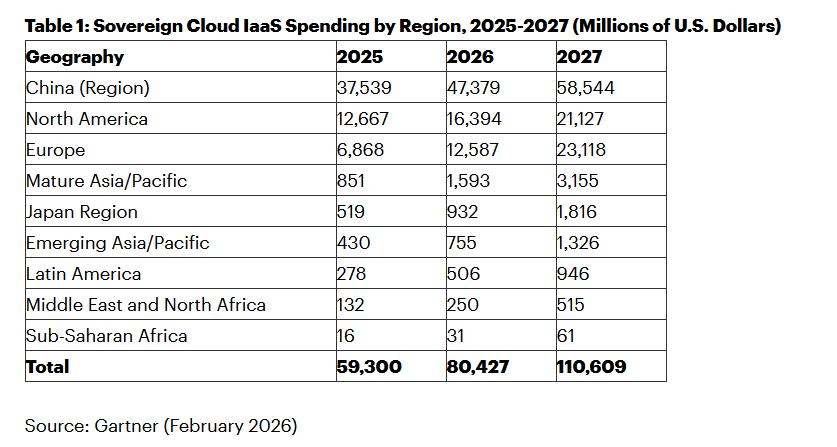 Gartner hervor. Demnach werden die weltweiten Investitionen in souveräne Cloud-IaaS im Jahr 2026 ein Volumen von rund 80 Milliarden US-Dollar erreichen. Das entspricht einem Anstieg von 35,6 Prozent gegenüber 2025.
