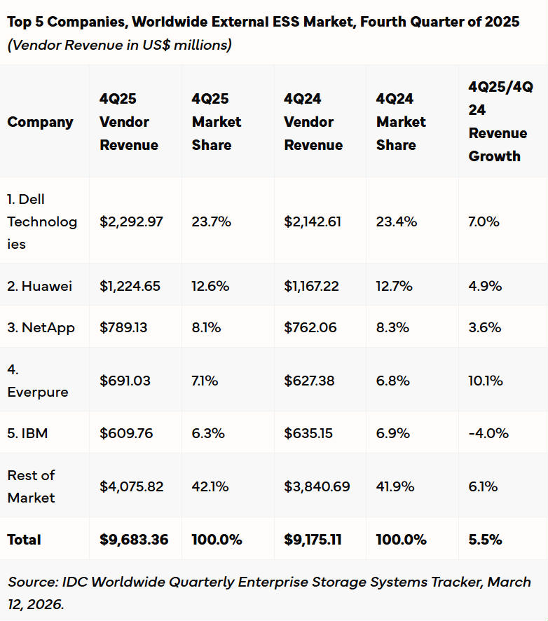 Der Markt für externe Storage-Systeme (Enterprise Storage Systems, ESS) ist laut den Marktforschern von IDC im vierten Quartal 2025 stabil gewachsen. Der gesamte Umsatz des Sektors betrug im Q4 9,7 Milliarden Dollar, ein Wachstum von 5,5 Prozent im Vergleich zum Vorjahr. Alle drei Unterkategorien konnten zulegen: Bei All Flash Arrays wuchs der Umsatz um 18,1 Prozent, HDD-Arrays legten immerhin um 3,1 und Hybrid Flash Arrays um 6,7 Prozent zu.