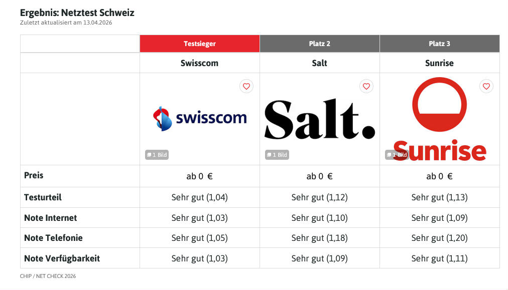 Beim alljährlichen Netztest der Zeitschrift "Chip" machte heuer erneut Swisscom das Rennen. Allerdings haben alle drei Telekommunikationskonzerne in sämtlichen Disziplinen die Wertung "Sehr gut" erreicht und die Unterschiede zwischen den Kontrahenten werden immer kleiner. Swisscom konnte die Gesamtnote von einer 1,07 auf eine 1,04 verbessern. Bei Salt, im Vorjahr ebenfalls auf Platz zwei, stieg die Schlussnote um 0,06 Punkte auf eine 1,12, während Sunrise sich mit einer 1,13 am meisten verbessern konnte; im Vorjahr holte sich der Anbieter noch eine 1,20.
