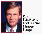Intel sich mit den gigantischen Profiten aus dem PC-Prozessoren-Geschäft im Rücken rechtzeitig auf die Zukunft einzustellen. Die Dominatoren des Prozessoren-Marktes versuchen nicht erst seit heute sich aus der Abhängigkeit von den PCs zu befreien. Nicht ohne Erfolg, hat sich doch der Absatz von Intel Networking-Produkten 1998 verdreifacht während der Absatz von Flash-Speichern langsamer, aber stetig wächst. Rob Eckelmann, Geschäftsführer von Intel für Europa erläuterte uns, wie seine Firma die Trends der Zukunft sieht: