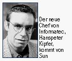 Die Zürcher Infomatec Retail AG hat in Hanspeter Kipfer einen neuen Country Manager gefunden und tritt ab sofort unter dem neuen Namen Informatec (Schweiz) AG auf. Der 36-jährige Kipfer kommt von Sun, wo er seit 1992 als Corporate Mitarbeiter tätig war. Infomatecs eigenes Betriebssystem JNT (Java Network Technology) findet im Home- (Surfstations, Webpads und Handys) und Businessbereich (Thin Clients) Anwendung.