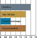 Zieht man einen Vergleich der einzelnen Distributions-Kategorien, so führen die Broadliner mit einem Notendurchschnitt von 7,3, vor den VADs/SW-Distis und den Komponentendistis mit einer Benotung von jeweils 7,2. Mit einem Schnitt von 6,9 bilden die Herstellervertretungen das Schlusslicht. Punkten konnten die Broadliner insbesondere im Bereich Logistik (8,1) und führen unangefochten vor den anderen Kategorien. Dieses Geschäft scheinen sie nach wie vor bestens im Griff zu haben. Im Bereich Verkauf könnten ihnen die VADs/Software/Spezial-Distis und die Komponentendistis aber schon bald den Rang ablaufen. Beiden Disti-Kategorien fehlen hier im Schnitt nur noch 0,1 Punkte, um an die Bewertung der Broadliner mit 7,8 heranzukommen. Mit einem Notendurchschnitt von 6,9 liegen die Herstellervertretungen im Vergleich mit den anderen Bewerbern deutlich zurück. Sie halten im Bereich Technik und Handelstreue in etwa mit den anderen Disti-Kategorien mit, Nachholbedarf besteht aber vor allem in den Bereichen Verkauf, Logistik und Preisniveau. (pbr)