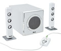 Trust mit der Modellbezeichnung SP 3600A 2.1 besteht aus zwei Satellitenlautsprechern mit einer Leistung von je 5 Watt sowie einem Subwoofer, der einem die Bässe mit 18 Watt liefert. Das System unterstützt einen Frequenzbereich von 60 bis 17’000 Hertz. Trust hat dem Set weiter eine kabelgestützte Fernbedienung spendiert, über welche das System eingeschaltet und die Lautstärke reguliert werden kann. Interessant ist die Art und Weise, wie das Lautsprechersystem mit mobilen Endgeräten wie MP3-Player oder PDAs genutzt werden kann. Die Fernbedienung verfügt hierfür über einen Audio-In-Eingang, an dem sich entsprechend gerüstete Player direkt anschliessen lassen.