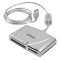 Kingston Technology hat mit dem 15-in-1-Hi-Speed-Reader ein universales Speicherkartenlesegerät vorgestellt, das mit den 15 gängigsten Memory-Cards zurechtkommt. Dazu zählen neben den gängigen Typen CompactFlash, SD und Smartmedia auch Small-Factor-Formate wie MiniSD- oder MMCMobile-Karten oder die diversen Varianten von Sonys Memory-Stick. Der Hi-Speed-Reader wird übers USB-2.0-Interface am Rechner angeschlossen. Laut Kingston erlaubt der Kartenleser Transfergeschwindigkeiten bis zu 60 MB pro Sekunde, allerdings nur, sofern auch entsprechende Karten zum Einsatz kommen.