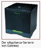 Mit dem «Appliance-Server» bringt Gateway einen Server, der klein, hübsch und nicht minder intelligent ist. Mit der «All-in-One»-Lösung zielt auch Gateway auf KMUs bis 100 Benutzer, die einen geringen Aufwand schätzen. Laut dem Luzerner Disti ALR soll der Micro-Server nämlich «mit dem geringsten Know-how und Aufwand installiert» werden können und sich selbst verwalten. Mit integrierten Tools kann eine Intranet- oder eine Internet-Homepage kreiert und bewirtschaftet oder ein individueller Mail-Server aufgebaut werden. Details: 10GB oder 20GB HD, Dual 10/100 Ethernet-Kontroller, Externer 5-port 10/100 Dual-Speed-Ethernet-Switch, 56K internes Modem oder optional WAN-Connectivity durch einen zweiten Ethernet Port.