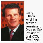 Oracle, Ray Lane, zurückgetreten. Der als seriös und eher zurückaltend geltende Lane war 1992 zu Oracle gekomen und wurde 1996 COO und Präsident der Firma. Als Nummer zwei hinter dem quecksilbrigen Larry Ellison war er für das Tagesgeschäft zuständig. Ellison wird Lanes Aufgaben vorläufig übernehmen. Ein Nachfolger wurde bisher nicht ernannt. Lane wird, wie Oracle mitteilt, weiterhin dem Verwaltungsrat angehören.