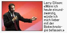 Oracle-Chef «Super Larry» Ellison jedoch kann das alles nicht mehr so recht begeistern. Eigentlich werde die Computerei langsam langweilig, meinte er. «Ich habe drei Generationen mitgemacht: Mainframe, Client/Server und Internet. Da wird so bald nichts Neues mehr kommen. Wäre ich heute einundzwanzig, würde ich mich lieber mit der Biotechnologie befassen.»