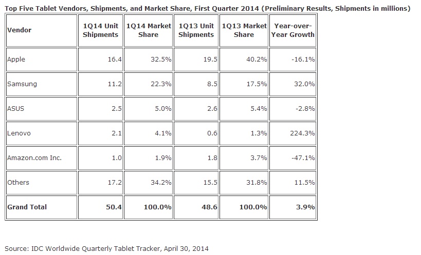 Angeführt wird der Markt nach wie vor von Apple, das im ersten Jahresviertel 16,4 Millionen Tablets verkauft hat. Allerdings musste der Marktführer Federn lassen: Die Absatzzahlen sanken innert Jahresfrist um 16,1 Prozent und der Marktanteil reduzierte sich von 40,2 Prozent auf aktuell 32,5 Prozent. Auf dem zweiten Platz liegt Samsung mit 11,2 Millionen verkauften Geräten, was im Vergleich zum ersten Quartal 2013 einer Steigerung um 32 Prozent gleichkommt. Entsprechend konnte der südkoreanische Elektronikkonzern seinen Marktanteil von 17,5 Prozent auf 22,3 Prozent erhöhen. Den dritten Rang belegt Asus mit 2,5 Millionen verkauften Tablets und 2-in-1-Geräten (-2,8%) und einem Marktanteil von 5 Prozent (-0,4%). Der grosse Gewinner im ersten Quartal ist allerdings Lenovo, das seine Absatzzahlen innert Jahresfrist um satte 224,5 Prozent steigern konnte. Verkaufte das chinesische Unternehmen im ersten Quartal 2013 noch 600'000 Tablets, so sind es nun ein Jahr später bereits 2,1 Millionen Geräte. Damit konnte Lenovo seinen Marktanteil von 1,3 Prozent auf 2,1 Prozent erhöhen und Amazon von Platz vier auf Platz fünf verdrängen.