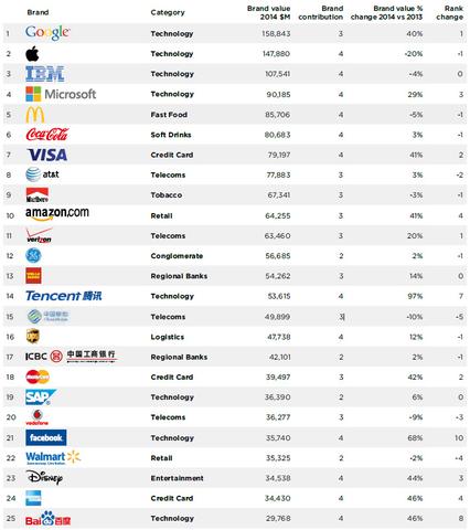 100 wertvollsten Marken rund um den Globus. Bei der aktuellen Erhebung 2014 liegt