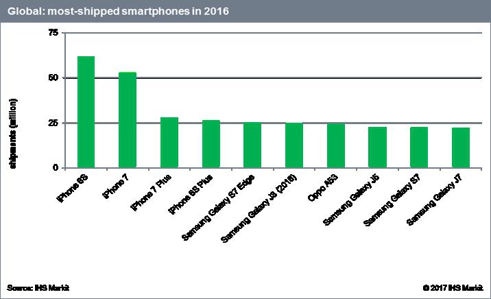 Die Marktanalysten von IHS Market haben Ausschau nach dem meistverkauften Smartphone des vergangenen Jahres gehalten und haben mit dem iPhone 6S einen eindeutigen Sieger gekürt, der sich rund um den Globus über 60 Millionen Mal verkaufte. Ebenfalls Absatzzahlen über 50 Millionen erreichte das erst vergangenen Herbst vorgestellte iPhone 7 auf dem zweiten Platz. Wie die Studienverfasser bemerken, wäre bei der Betrachtung des vierten Quartals allein das iPhone 7 das mit Abstand meistverkaufte Smartphone gewesen, gefolgt vom grossen Bruder, dem iPhone 7 Plus.