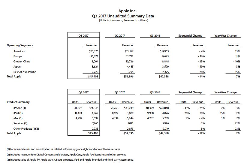 Apple hat die Unternehmenszahlen für das dritte Quartal seines laufenden Fiskaljahres offen gelegt. Dem Unternehmensbericht lässt sich entnehmen, dass Apple sowohl seinen Umsatz als auch seinen Gewinn gegenüber dem entsprechenden Vorjahresquartal steigern konnte. Wurden im dritten Quartal 2016 noch 42,358 Milliarden Dollar erwirtschaftet, waren es heuer 45,408 Milliarden Dollar. 61 Prozent dieses Gesamtumsatzes wurde dem Bericht zufolge ausserhalb den USA generiert – 10,675 Milliarden Dollar davon in Europa. Der Gewinn stieg derweil von 1,42 Dollar auf 1,67 Dollar pro verwässerter Aktie beziehungsweise von 7,796 Milliarden auf einen Nettogewinn von 8,717 Milliarden Dollar.