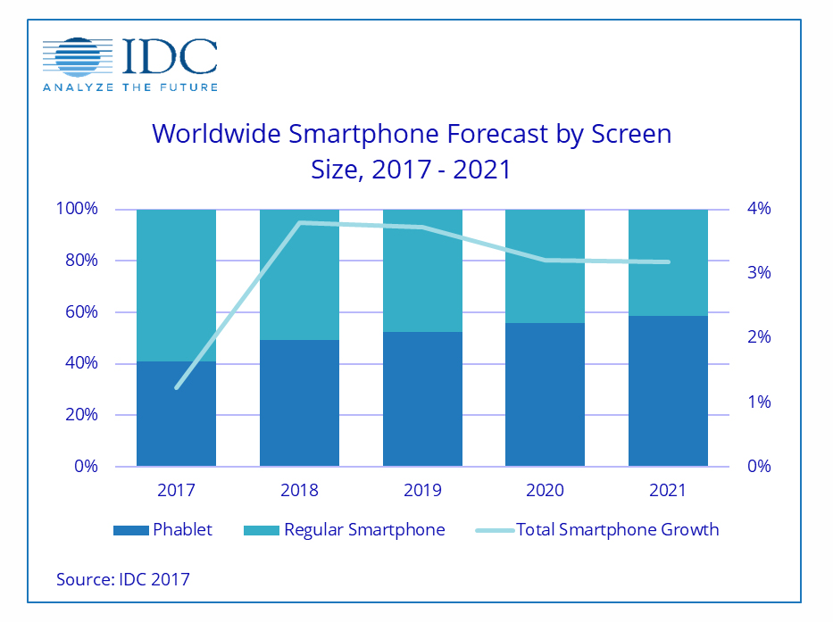 Die Marktforscher von IDC gehen davon aus, dass die Zahl der verkauften Phablets in den nächsten Jahren die Smartphone-Verkäufe übersteigen werden. Von den im laufenden Jahr verkauften rund 1,5 Milliarden Smartphones handelte es sich bei 611 Millionen Geräten um Phablets, also Smartphones mit einer Diagonale zwischen 5,5 und 7 Zoll. Gemäss der Prognose wird der Smarthone-Absatz bis 2021 auf 1,7 Milliarden Geräte ansteigen, wovon es sich bei einer Milliarde um Phablets handeln wird. Sollten die Analysten Recht behalten, wird der Phablet-Bereich eine mittlere jährliche Wachstumsrate von gut 18 Prozent aufweisen. Deutlich weniger gut soll derweil das Business mit konventionellen Smartphones laufen, für die eine negative Wachstumsrate von 7,4 Prozent prognostiziert wird. Für den gesamten Smartphone-Markt rechnet IDC für die Jahre bis 2021 mit einer durchschnittlichen jährlichen Zuwachsrate von 3 Prozent. In der letzten Untersuchung gingen die Marktforscher noch von höheren Zahlen aus.