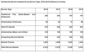 voraus. Getragen werden soll diese Entwicklung in erster Linie von den Verkäufen von Ultramobiles und Smartphones, die weiterhin ein stärkeres Wachstum verzeichnen können als die restlichen Bereiche. Die Premium-Ultramobiles verzeichnen mit einem Anstieg von 59 Millionen verkauften Geräten im Jahr 2017 auf 70 Millionen im 2018 als einzige Kategorie im PC-Bereich einen Anstieg. Klassische Notebooks werden mit einem prognostizierten Rückgang von 6,8 Prozent am meisten einbüssen, während der Verkauf von regulären PCs einen Rückgang von 5,4 Prozent verzeichnen wird.