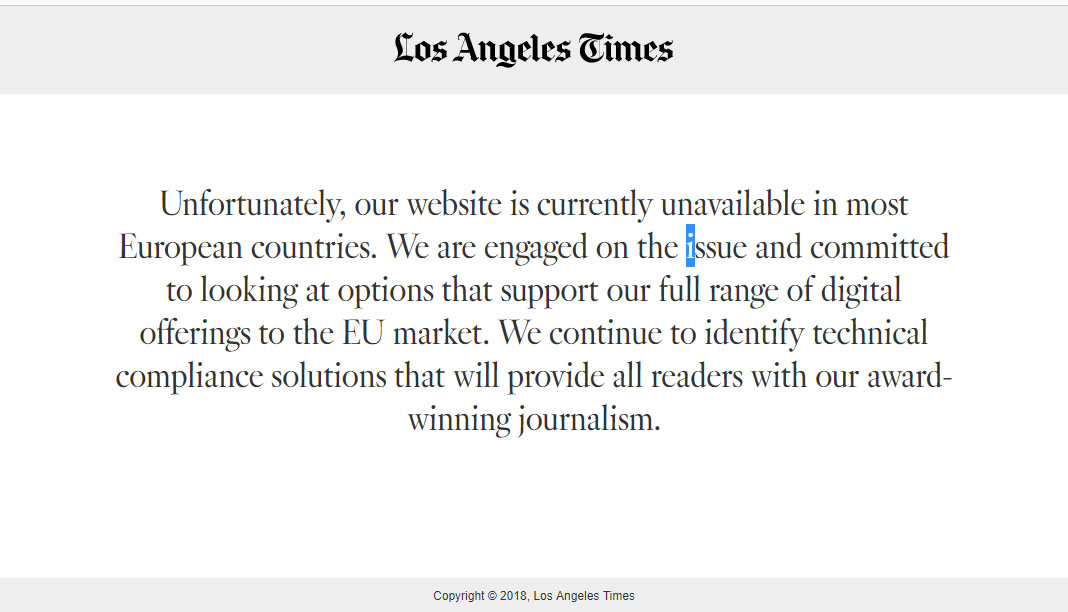 Aktuell werden Webbenutzern mit IP-Adressen aus EU-Ländern beispielsweise die Online-Angebote von bekannten Publikationen wie "LA Times", "New York Daily", "Chicago Tribune" oder "Baltimore Sun" gesperrt. Die Besucher bekommen statt den üblichen News lediglich einen Hinweis eingeblendet, in dem versichert wird, man man halte nach Compliance-Lösungen Ausschau, um das Angebot wieder allen Benutzern zur Verfügung zu stellen. Alle genannten Publikationen gehören dem Chicagoer Verlagshaus Tronc.
