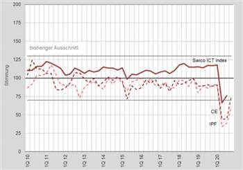 Der Swico ICT Index, der aktuell – in einer verkürzten Version – im Monatsrhythmus die Konjunkturaussichten der Schweizer ICT-Branche misst, bleibt trotz der positiven Signale insgesamt noch in allen Teilbranchen unterhalb der Wachstumsgrenze. Er liegt aktuell bei 83,5 Punkten und somit nach wie vor unter der Wachstumsgrenze von 100 Punkten. Dennoch resultiert gegenüber dem Vormonat ein Plus von 7,3 Punkten, wobei alle Teilsegmente der gesamtschweizerischen ICT-Branche eine Zunahme verzeichnen.