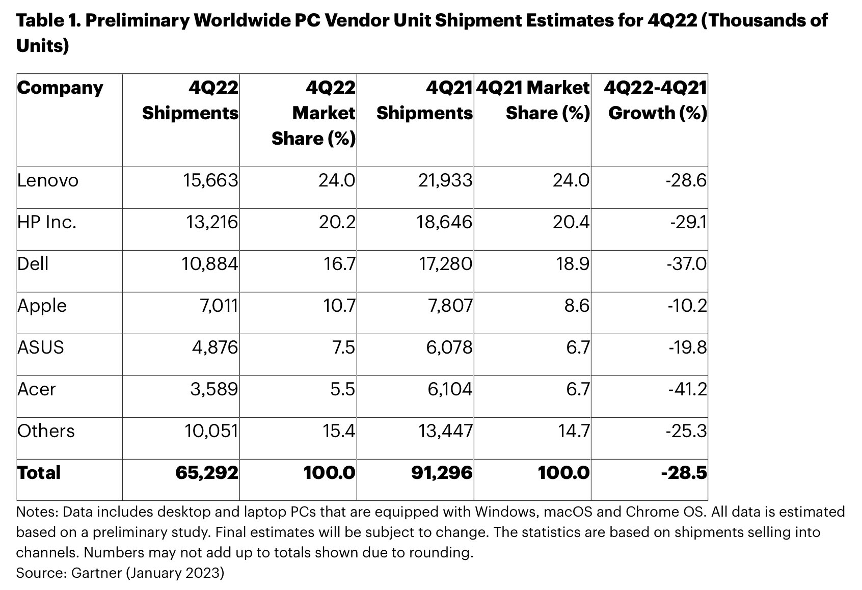 Laut den neuesten vorläufigen Gartner-Marktzahlen wurden im vierten Quartal 2022 weltweit 65,3 Millionen PCs verkauft, das sind 28,5 Prozent weniger als im entsprechenden Vorjahresquartal. Es handle sich um den grössten quartalsmässigen Rückgang seit Beginn der Erhebungen Mitte der 1990er-Jahre, merken die Marktforscher dazu an. Aufs gesamte Jahr 2022 gerechnet verzeichnet